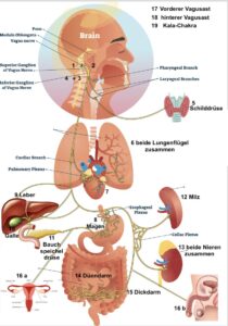 Der Vagusnerv (der 10. Gehirnnerv) ist der Ruhenerv und Teil des Parasympathikus. Nur in der Ruhe kannst du gut heilen. Daher liegen darauf Hunderte von Heilkraft-Chakren sowie einer der drei Wege der Kundalini. Wir gehen mit den Vagusnerv-Chakren durch alle Organe hindurch, was diesen viele Heilungsimpulse schenkt. Indem wir den 10. Hirnnerv energetisieren, wird zudem die Gehirnleistung verbessert. Außerdem befindet sich der Aggressions-Bewältigungs-Motor darin. Dieser ist auch in der Bauchspeicheldrüse, im Zwerchfell und in der Gallenblase vorhanden. Zudem gibt es spannende Chakren an den Rumpf-Außenseiten, in denen sich ebenfalls Aggressionsenergien sammeln. Die Christalle des Aggressionsbewältigungs-Motors befinden sich dort und lösen diese Energien auf, wenn er optimal funktioniert, was meist nicht der Fall ist.